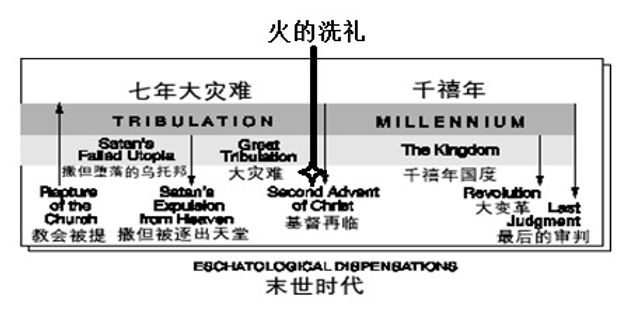 火的洗礼则与基督的第二次降临有关。当基督再度来临时,祂会寻找两类人:信的人和不信的人。不信的人会被抛到火里,信的人则会进入耶稣基督作王的千禧年国度。
